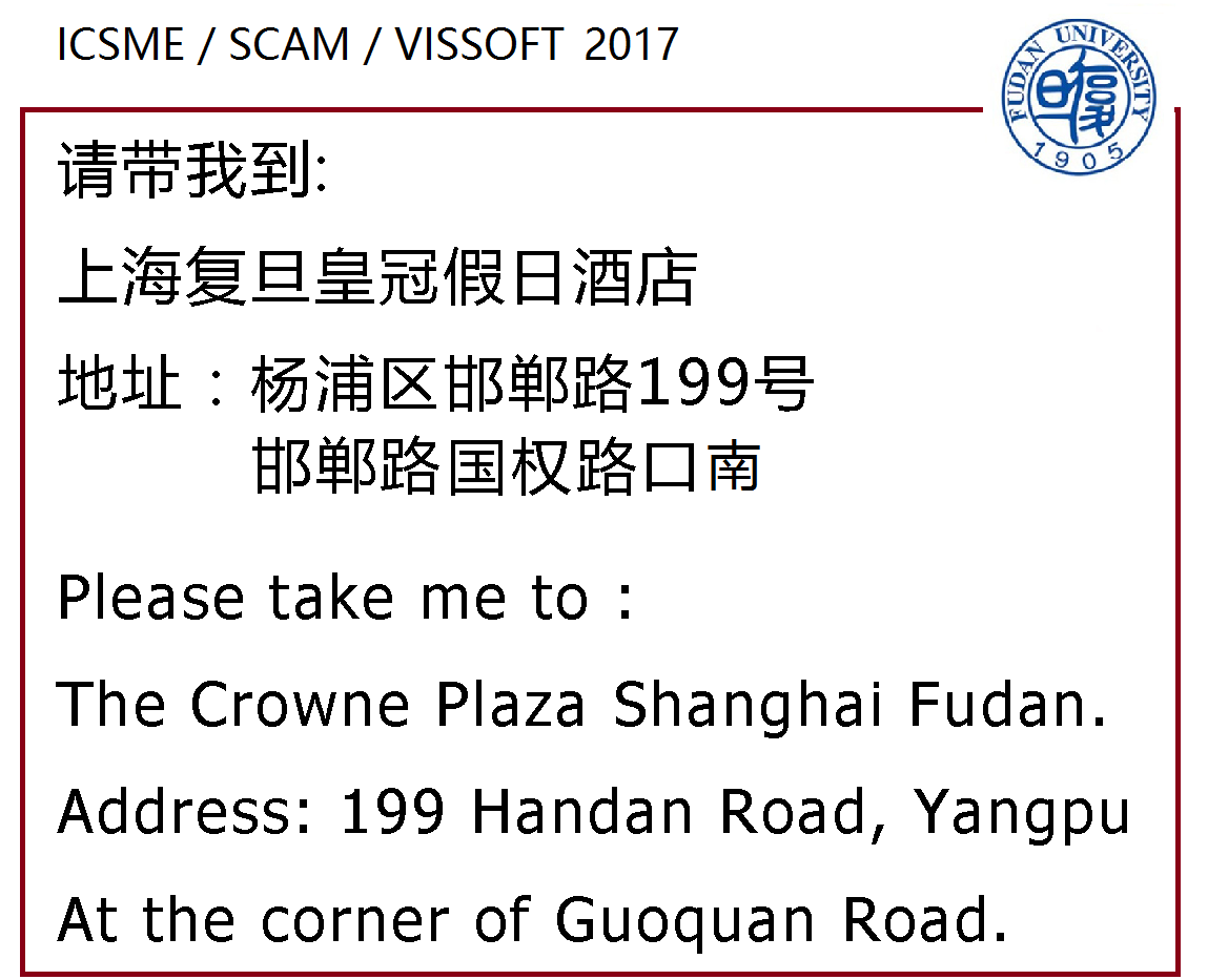 Crowne Plaza Shanghai Fudan is located at 199 Handan Road, Yangpu District. The main entrance of the hotel is on the Guoquan Road. Taxi drivers in Shanghai usually do not speak English, so we suggest that you show the following instruction to the driver when you get in the car.